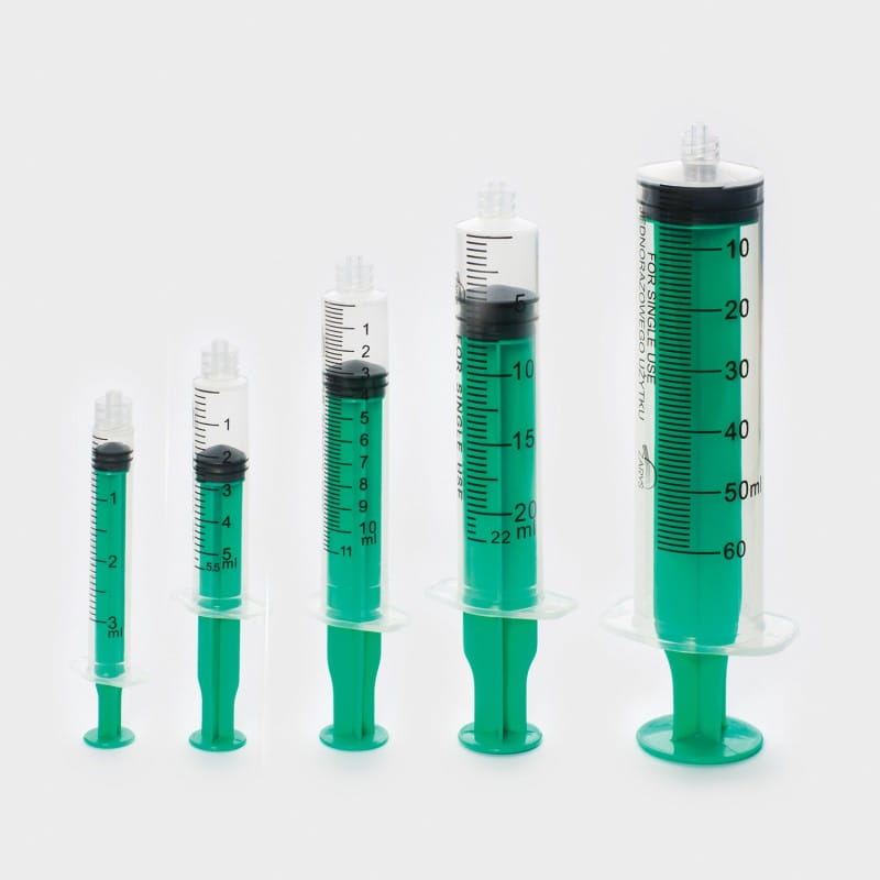 - Strzykawka zbudowana z trzech części, cylinder z zielonym tłokiem oraz bezlateksowy uszczelniacz, dla płynnego przesuwania tłoka